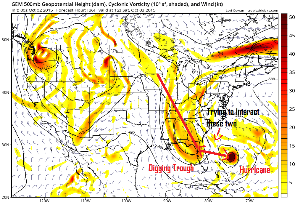 Good morning. My thoughts discussed last night are on track. Hurricane Joaquin has begun to slowly take its turn northeast and it should avoid any interaction with the trough that is over the United States. Mostly all major models are in this camp now. I will mention there are a few outliers, but the models that are outliers are the worst skill scoring models such as the Canadian below..