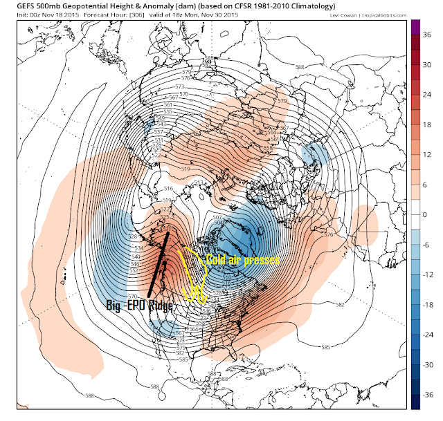 So what is my point here? My point is that the recent mild weather we have had does not concern me and I have the research I did on this winter to back it up. Of course I could be wrong and the whole winter could be mild, but that is not my forecast. I see no reason based on my observations to go back on any of my original winter ideas. I hope you guys can see how weather patterns do have to evolve sometimes and the images below hopefully show how this evolution CAN happen. It will not be exactly like this but I think the overall theme works out well.